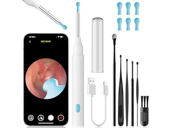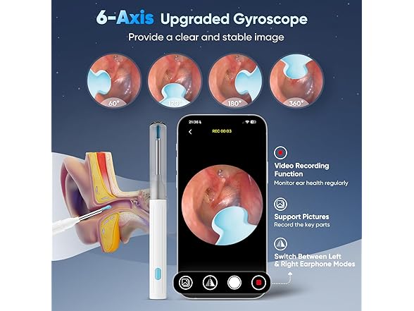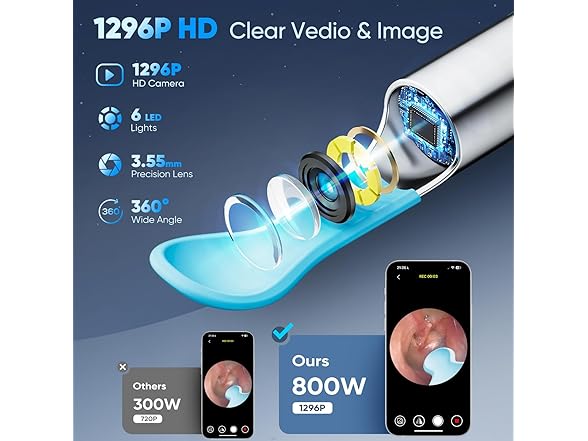 - 1296P HD Ear Camera: The ear wax removal kit features a 8 million pixels high precision lens, 1296P high-resolution camera with 6 LED lights. 360°wide-angle lens enabling you to see every corner of the ear canal. Suitable for adults, check teeth, nose, throat, scalp root, and other body parts