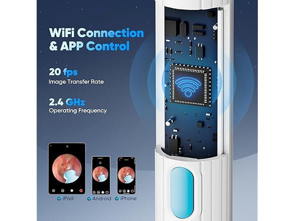 - Support Android, IOS and Other System Devices: Scan the QR code to download the APP. Press and hold the switch button to turn it on, and connect the ear wax removal through the device's WIFI to start using. Ear-care cleaning you can see on your phone screen, supports taking pictures and recording videos, and features a real-time view via 20fps rate transferring between the earscope and the phones/tablets whether iOS, Android or other system devices