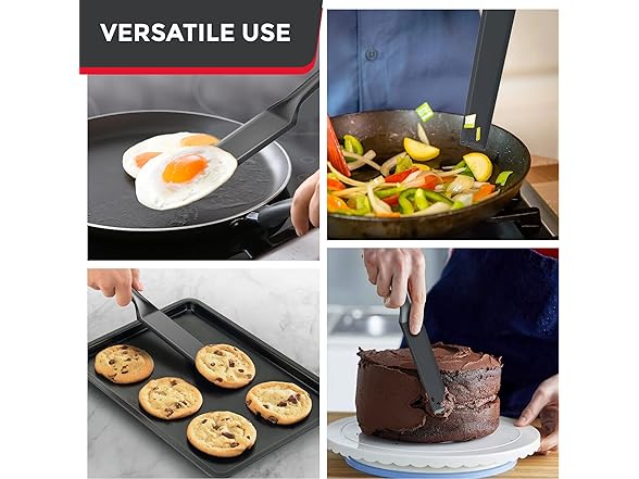 - Multitasker – Flip eggs, hamburgers, pancakes, crepes, ice the cakes, cut and lift corner pieces of baked frittatas or simply stir-fry, turning ingredients inside a searing-hot wok.