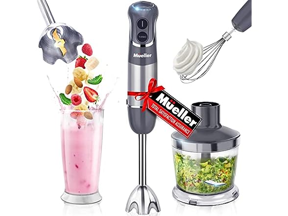 Mueller Smart Stick 800W, 12 Speed and Turbo Mode, 3-in-1, Heaviest Duty Copper Motor Immersion Blender, Titanium Steel Blades Hand Blender, Comfygrip Handle, Whisk, Beaker/Measuring Cup