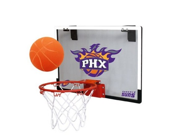 Show support to your favorite team. The Rawlings NBA Game On Basketball Hoop and Ball Set features authentic look and feel backboard. Though convenient to hang over the door of your room, the 18" wide backboard can also be taken along to a tailgating party at the Stadium or a game in the backyard! Polish your basketball shooting skills with the set which bears the emblem of athletic greats.