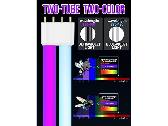 - Dual-Wavelength Attraction – Features two-color light tubes that emit a broad spectrum of UV light, effectively luring mosquitoes, flies, and other pests for superior trapping performance.