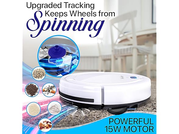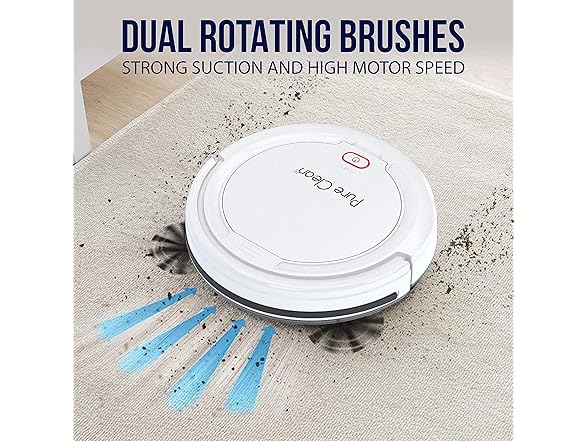 - DUAL ROTATING BRUSHES: The automatic vacuum cleaner robot pet hair robo vac has 2 rotating side sweeper brush to reach dirt/debris along walls or edges. No clogging from cat/dog pet hair. Works on hardwood, linoleum, tile, low/hard carpet floors