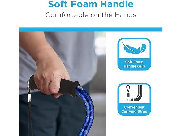 - Comfort foam hand grip with wrist strap for convenience: Soft, non-slip foam handle reduces hand fatigue and improves comfort during walks; built-in strap helps keep cane for women and men nearby when seated or standing
