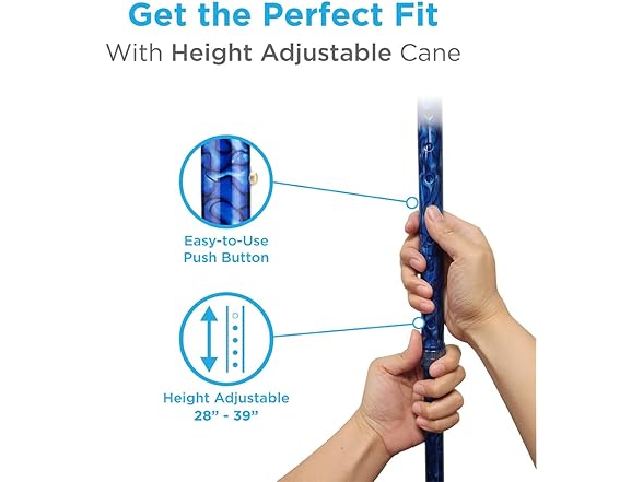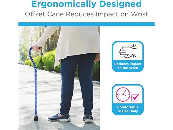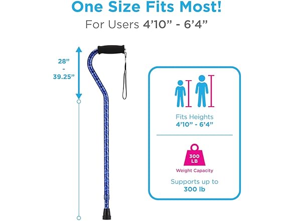 - Offset walking cane for elderly adults and caregivers: Designed for optimal wrist alignment and walking support; lightweight frame adjusts from 28 to 39 inches to fit users 4'11" to 6'4" with a 300 lb weight capacity