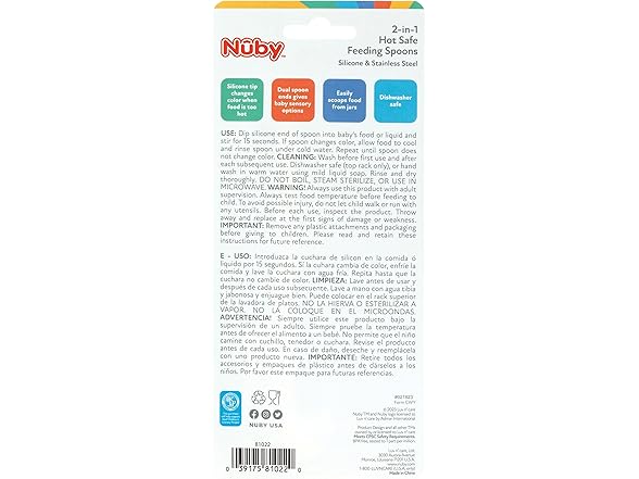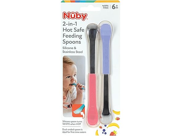 - SPOON SET FOR BABIES 6+ MONTHS: Nuby's 2-in-1 Hot Safe Spoons are perfect to use at breakfast, lunch, and dinner; Spoon design helps to scoop food from hard-to-reach areas in baby food jars