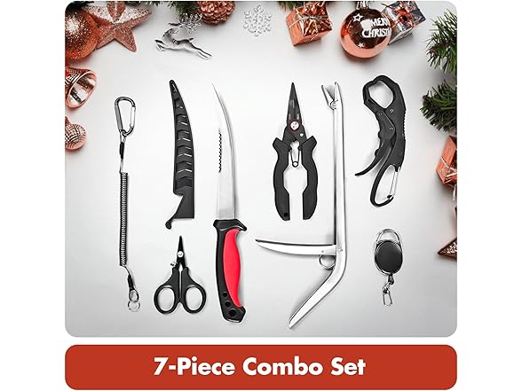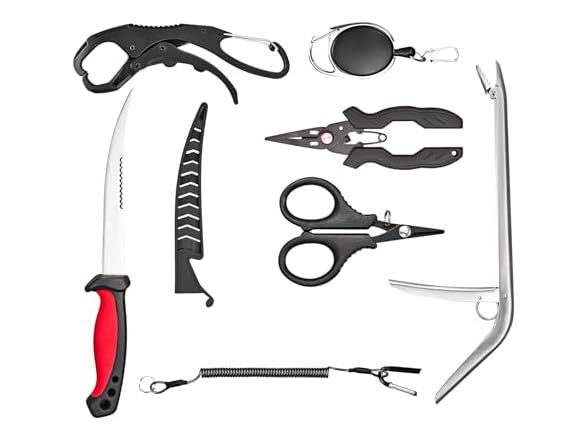 OH MY WOW Fishing Tool Kit 7 Piece Pliers, Fillet Knife, Hook Remover, Split Ring Plier, Lip Gripper, Scissors and Retractor for Saltwater and Freshwater