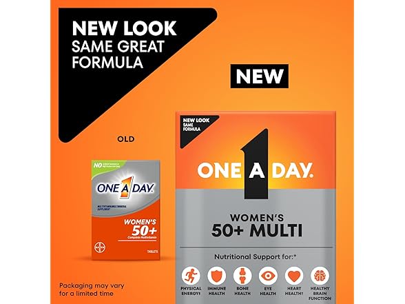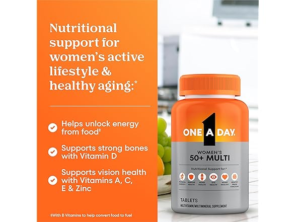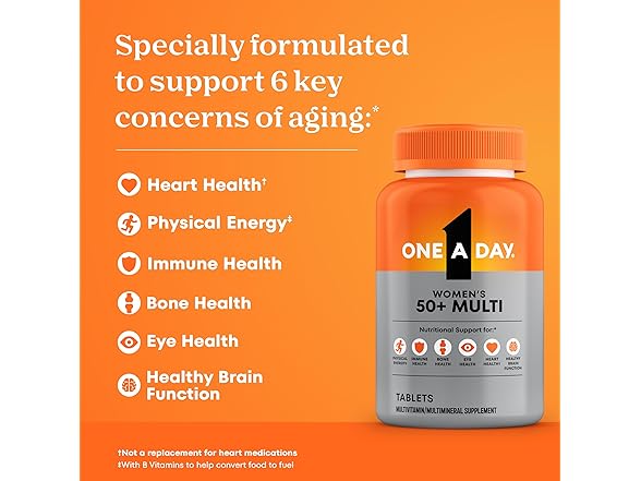 - Nutritional support for what matters most: One A Day womens 50 plus multivitamins are specially formulated with an excellent source of 15 essential nutrients to support 6 key concerns of aging:* bone health, immune health, physical energy(1), heart health(2), healthy brain function & eye health