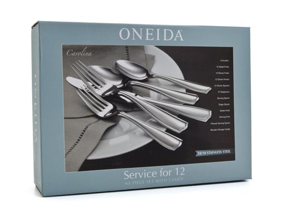 Oneida T474065A 65 Piece Carolina Flatware Set with Storage TraySpecs