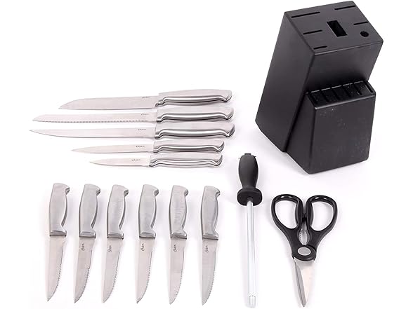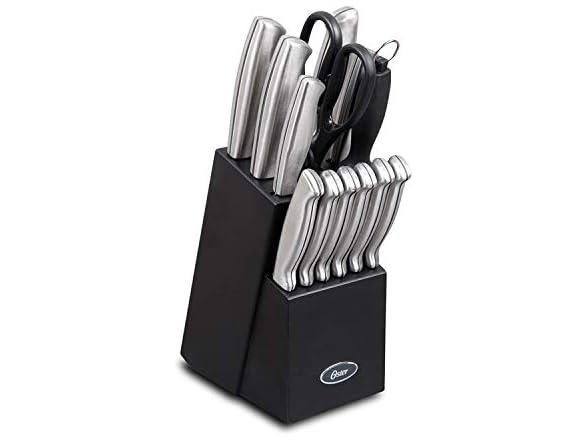 Oster Baldwyn 14 Piece Stainless Steel Cutting Kitchen Knife Cutlery Set with Swivel Block Holder and Knife Sharpener, Brushed Satin