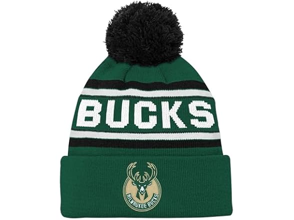 Outerstuff NBA Kids Youth 8-20 Officially Licensed Primary Logo Sport Knit Cuffed Cold Weather Pom Beanie Hat (US, Alpha, One Size, Milwaukee Bucks)