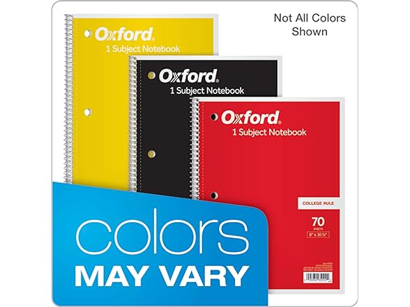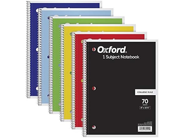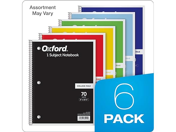 Oxford Spiral Notebook 6 Pack, 1 Subject, College Ruled Paper, 8 x 10-1/2 Inch, Color Assortment Design May Vary (65007)