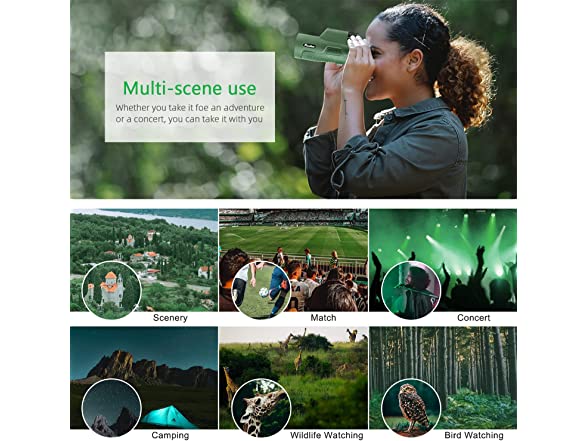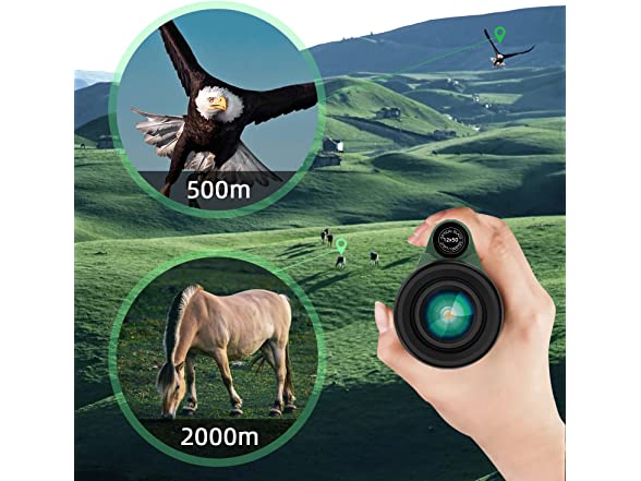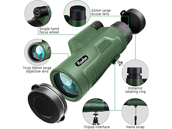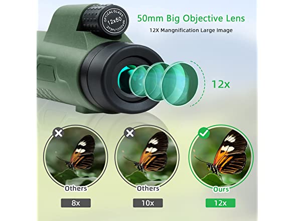 - đ„ă12Ă Magnification & 50mm Objective Lensă12Ă50 High Power Magnification Monocular provides a clearly, bright image and different fields of view. Perfect for Hiking, Hunting, Climbing, Bird watching, Ball games, Concerts, Travel, Watching Scenery.