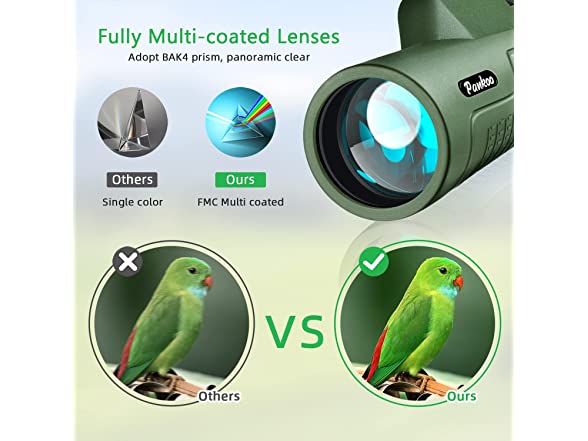 - đăHigh Contrast and Clear Images without Black Barsă This Monocular Telescope equipped with the BAK4 prism and Fully Muti-Coated lens. The larger the objective lens, the more light that enters to the monocular, and the brighter the image. Clear image without black bars, it makes Super Clear and Sharp Images.