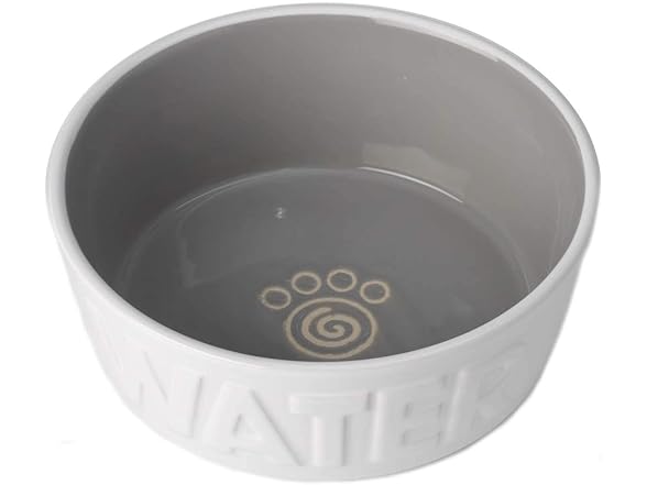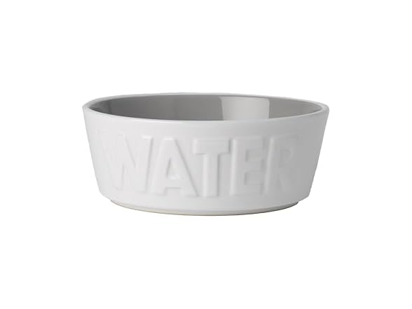 PetRageous, Back to Basics dog water bowl is a great addition to your dog or cat feeding routine. This bowl is designed to provide optimal convenience and functionality for medium and large dogs and cats, with a 6-inch diameter, 2.25-inch tall, and 2.5-cup capacity. Made with 100% ceramic stoneware this dog water bowl is durable, easy to clean, and dishwasher and microwave safe. The sleek and stylish white color adds a modern touch to your home décor. This dog bowl is glazed to create a non-porous surface for dogs and cats while drinking. WATER is embossed in white on the exterior and the interior of the dog bowl is grey. The smooth surface of the bowl makes it easy to clean and maintain. This pet bowl is perfect for medium and large dogs and cats, providing a comfortable and hygienic way for your pets to enjoy their water..
