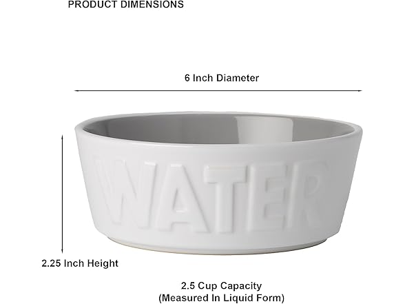 - Capacity And Size: 2.5-cups capacity measured in liquid form with dimensions of 6-inches in diameter by 2.25-inches tall; generous size for water for small dogs and medium dogs
