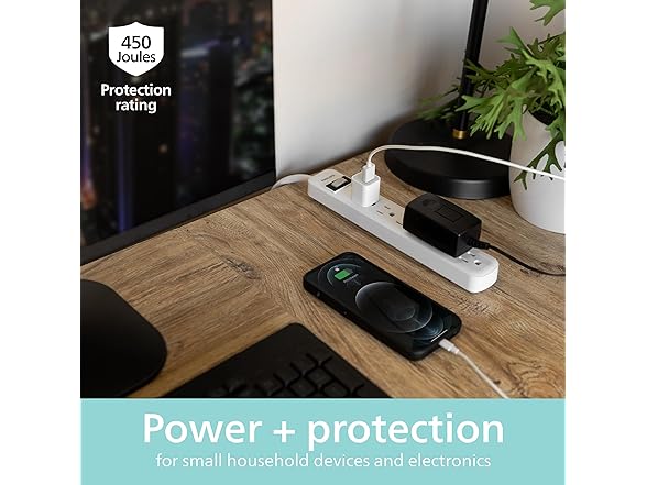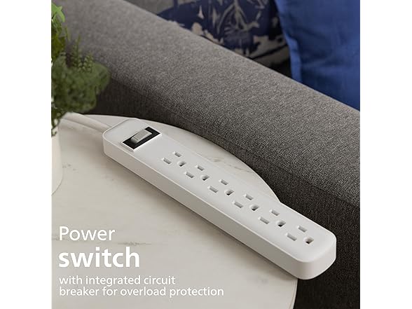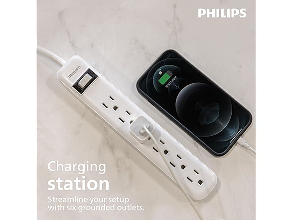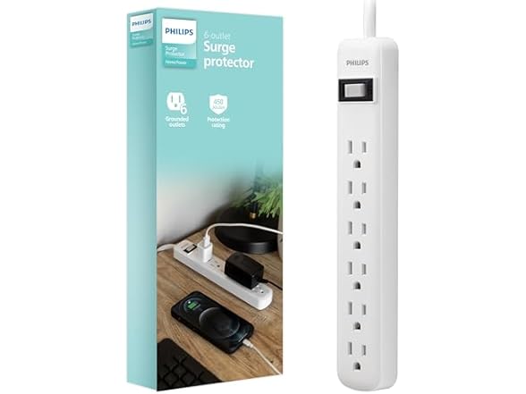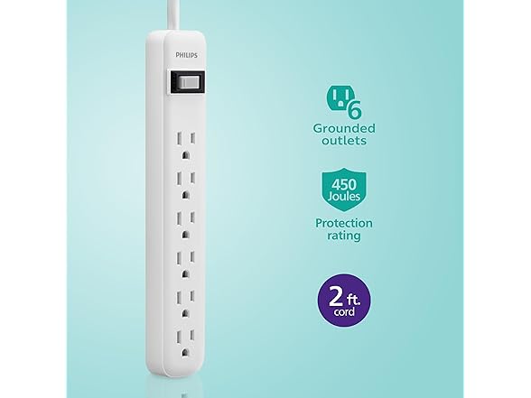 Philips 6 Outlet Power Strip Surge Protector, 2ft Power Cord, Straight Plug, Wall Mount, 450 Joules, UL Listed, Circuit Breaker, Automatic Shutdown, White, SPP3063WP/37