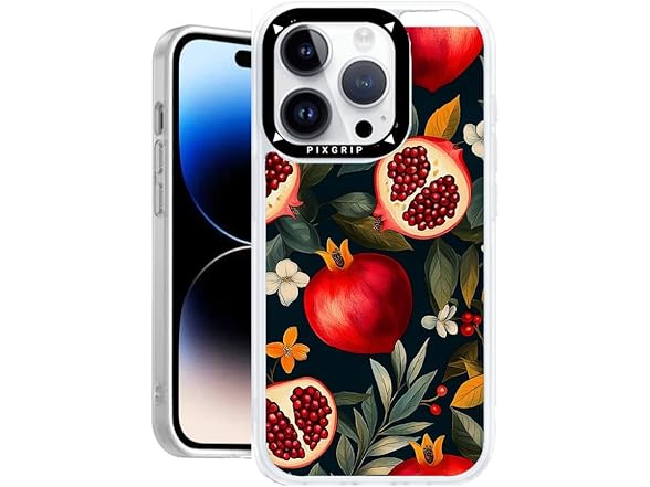 PixGrip Case for iPhone 16 Pro and Pro MAX, Tropical Fruits Design, TPU Sides, Hard Plastic Back (Tropical Pomegranate, for iPhone 16 Pro Max)