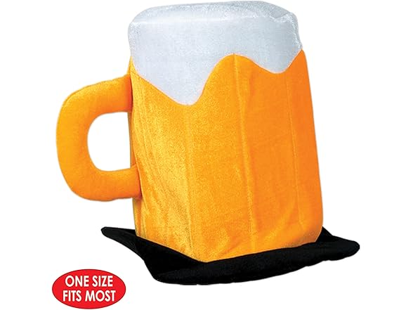 Raise a toast to fun and laughter with the Beistle Plush Beer Mug Hat, a lighthearted costume accessory that’s perfect for beer lovers and partygoers alike. This novelty hat features a playful design shaped like a foamy beer mug, complete with a golden plush “glass,” white froth top, and handle for a realistic touch. Soft, comfortable, and easy to wear, this oversized hat fits most adults and instantly adds a humorous twist to any festive occasion.