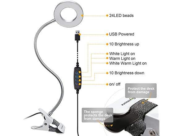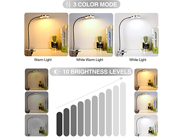 - ❤ ADJUSTABLE 10 BRIGHTNESS & 3 LIGHTING MODES: The LED Clip Desk Lamp has 3 Lighting Colors, warm light , warm–white light and white light . Each lighting mode has 10 brightness dimming levels.Warm light can creates more warm and peaceful atmosphere, perfect for night sleeping or relaxing. white light is better for your working, reading or studying.