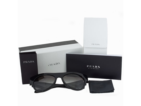 These Prada PR28QS 1AB0A7 Sunglasses feature a remarkably appealing black full rim single bridge oval frame. The design is beautifully complimented with alluring grey gradient lenses, thick black paddle arms and silver toned branding on the temples. Measuring 56-18-140mm, this item ships with its own case, lens cleaning cloth, and manufacturer's documentation.
