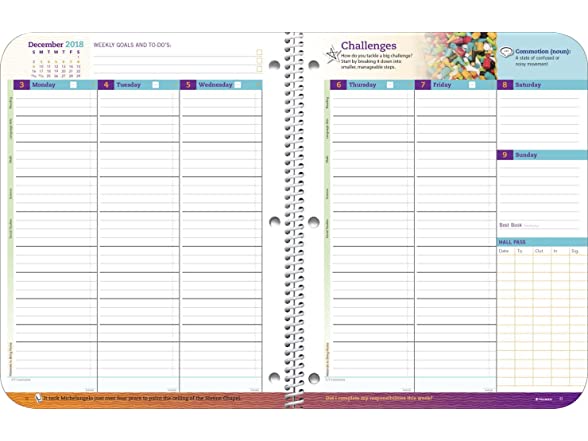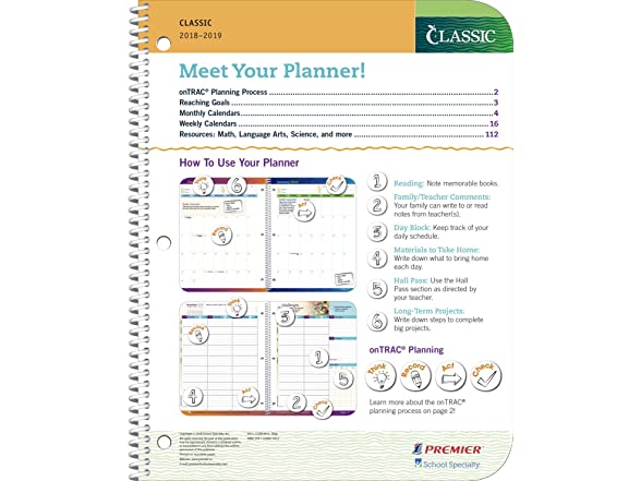 Premier Classic is a middle school student planner that also helps students develop basic planning skills and complete assignments. It features vertical weekly block dates from August 2018 to July 2019 in 128 pages. The planner measures 8 x 10 inches and conveniently fits into backpacks and binders. Item available to ship in May, 2018. Covers may vary.