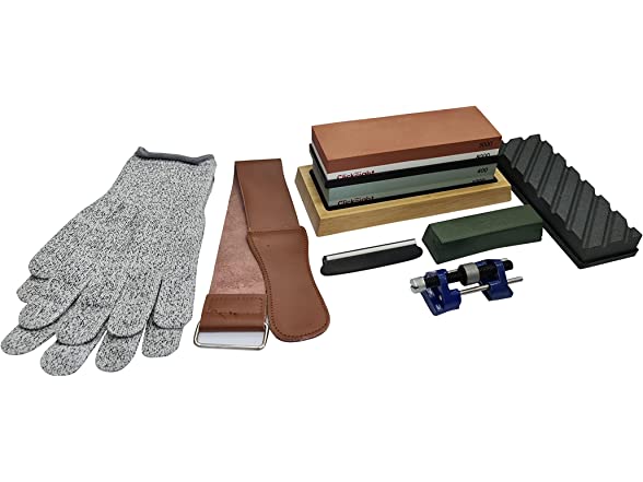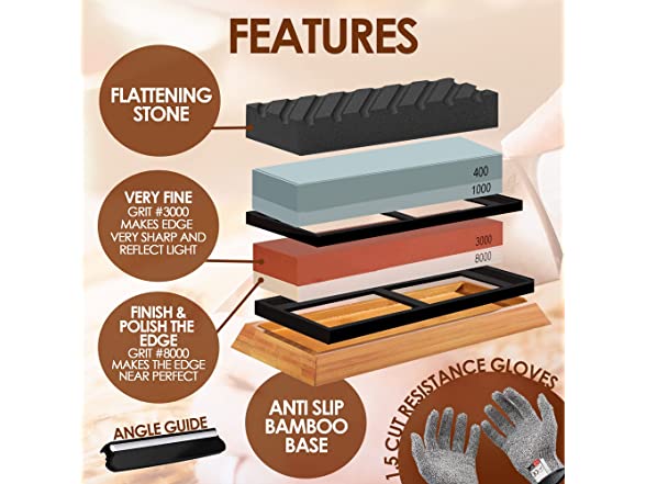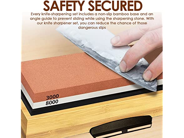 - SAFETY SECURED & PACKAGE INCLUDED: Every knife-sharpening set includes a non-slip bamboo base and an angle guide to prevent sliding while using the sharpening stone. With our knife sharpener set, you can reduce the chance of those dangerous slips. Angle guide, Non-slip rubber silicon base holder, Non -slip Bamboo base holder, Polishing Paste, Flattening Stone, Leather Strip 2, Gloves, Honing Guide & Clean Cloth are included in the package.