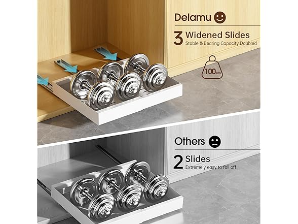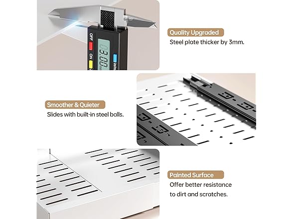 - 【What We Have Upgraded】 1) The steel plate thickness has been increased by 3mm, enhancing the drawer's load-bearing capacity to 15kg. 2) An additional slide has been added to the bottom of the drawer, preventing the middle from bending under heavy loads (now with a total of 3 slides). This ensures smoother and quieter sliding for a better usage experience.