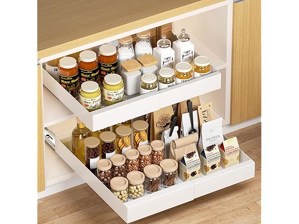- 【Convenient Slide-Out Cabinet Organizer】 The slide-out cabinet organizer makes organizing your cabinet space a breeze. You can maximize cabinet space and effortlessly access all your pots, pans, small kitchen appliances, cleaning products, canned goods, and other items.