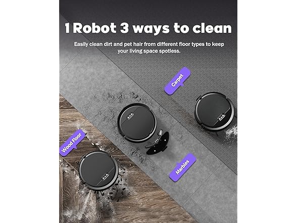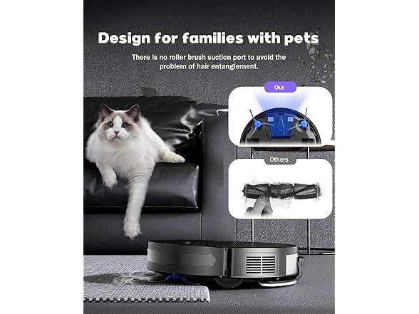 【Engineered for Pet Owner】 Unique air intake design won't get clogged with pet hair like other robotic vacuums with roller brushes, with high efficiency filter and 650ml extra large capacity dust box.
