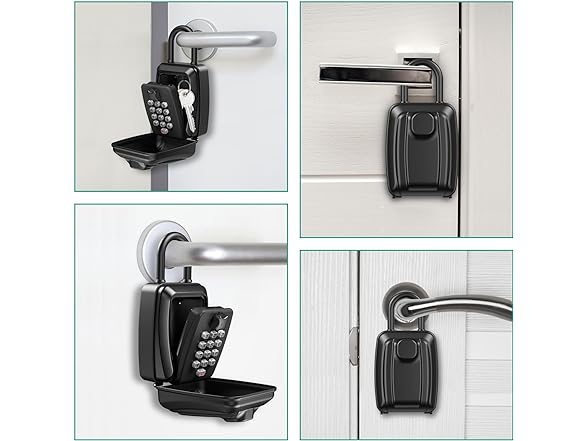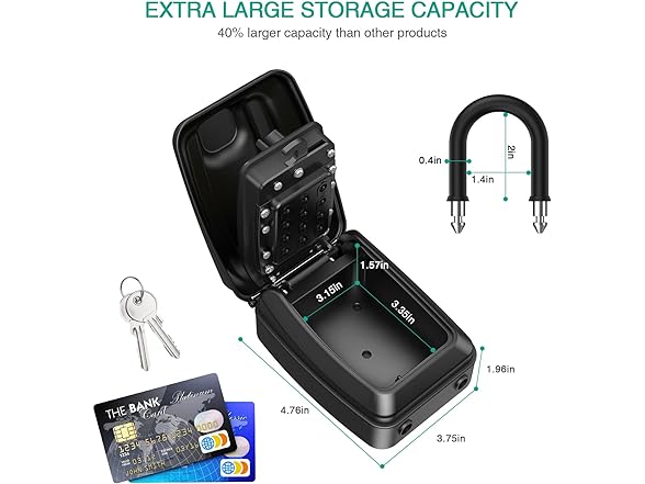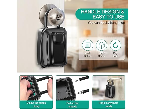 - 【Large -capacity & Easy to Install】The internal space of the upgraded key safe box is larger, which can store 5 keys, and there is a key hook inside, make keys no longer messy. You can also store door cards and bank cards. With a hanging shackle, no need to punch holes on the wall, just hang it exactly where you need like door knob or car.