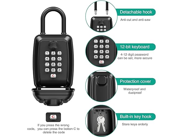 - 【Simple Operation with Reset Button】No need to dial the password, enter your password like using an old-fashioned mobile phone, you can easily open the lock box. Button C is the reset button. When pressing the wrong password, just press the reset button and then press the password again.