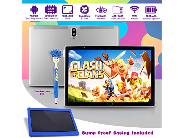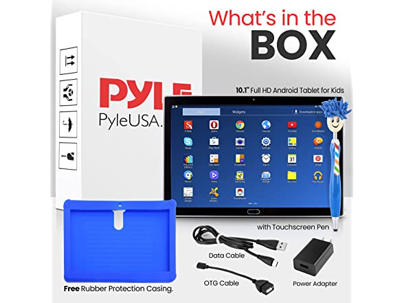 In the Box:- (1) 10.1” Kids Tablet w/Stylus Pen - 10.1-Inch Android Tablet w/ 1080p HD Display, Dual Camera, WiFi Compatibility, Quad-Core Processor, 1GB RAM, 8GB Storage, Kid-Proof Cover (Blue)