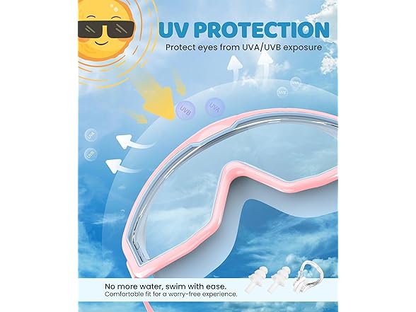 - 【UV-PROTECTED KIDS SWIMMING GOGGLES】Engineered with UV-absorbing lenses, these swim goggles kids offer premium defense against harmful sun rays. The advanced coating blocks 99% of UVA/UVB radiation, letting young explorers safely discover underwater worlds during pool sessions or beach adventures.