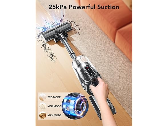 - Powerful Cleaning Performance: QIKCLN cordless vacuum cleaner is equipped with 23000pa suction power, with three suction modes, Max mode is suitable for cleaning larger particles such as coffee beans, and cat litter, Mid mode is suitable for cleaning smaller particles such as carpet crumbs, ECO mode can be used to clean pet hair, etc. From carpets to hardwood floors, our cordless vacuum cleaner handles it all