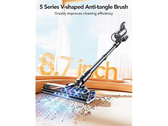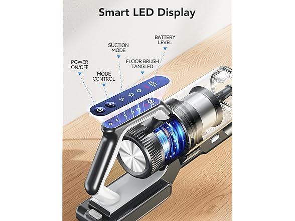 - Larger Floor Brush: The larger-diameter floor brush features a combination of soft and hard bristles, which effectively reduces hair entanglement. When clogged, the intelligent display will remind you to clean the hairs inside the floor brush. When shutting down at low speed, the cordless vacuum will automatically switch to high-speed delayed shutdown to avoid garbage backing up. The floor brush with LED light can be placed 180° flat to illuminate hard-to-reach dark corners