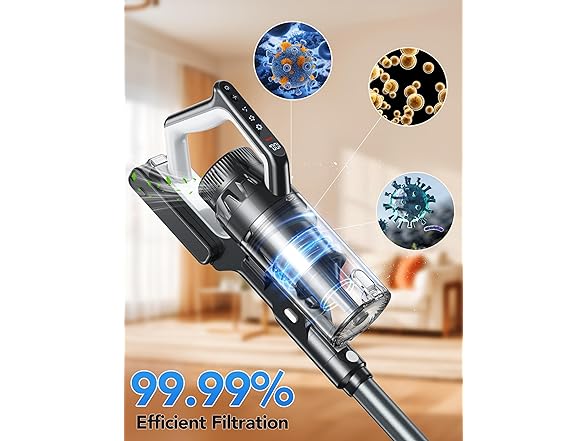 - Enhanced Filtration System for Cleaner Air: Our cordless stick vacuum cleaner adopts a high-density mesh structure with advanced cyclone technology and good airflow control, Five-stage sealed cyclone filtration system, and a filtration efficiency of up to 99.99%, which can capture particles as small as 0.1 microns. The double-layer HEPA filter purifies dust into cleaner air, quickly creating a healthier environment. Regular cleaning of filters and sponges prevents weak suction and clogging