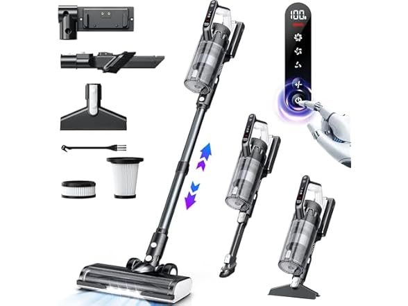 HIGH-speed delayed shutdown When shutting down at low speed, the machine will automatically switch to high-speed delayed shutdown, sucking the garbage into the dust cup to avoid pipe blockage. Efficient multi-seal filtration system can capture particles as small as 0.1 microns. Can be handheld and extended for use with the equipped sofa brush and long crevice tool, the vacuum cleaner can be handheld on sofas, corners, car seat lamps, and other places. Various forms The telescoping rod allows you to easily clean high curtains, ceiling moldings, and light fixtures. vacuum cleaners can be handheld on sofas, corners, car seat lamps, and other places. LED panel and floor brush with LED light The easy-to-read panel allows for easy switching of three moder It can run for up to 45 minutes in MIN mode, 30 minutes in MID mode, and 15 minutes in MAX mode. Upgraded 5 Series Floor Brush and Smart Blockage Prompt The floor brush has an LED light, making it easier to see the location of dust