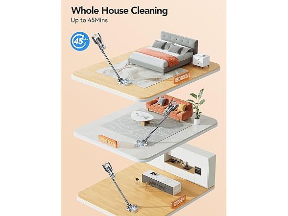 - Say Goodbye to Constant Recharging: Our vacuum cleaner features a powerful rechargeable battery, it can run for up to 45 minutes in ECO mode, 30 minutes in MID mode, and 15 minutes in MAX mode. In ECO mode, a single charge can clean up to 1,000 square feet of floor or carpet. Easily cleans both small and large spaces. LED display can monitor the power mode and battery level in real-time to avoid interruptions in cleaning