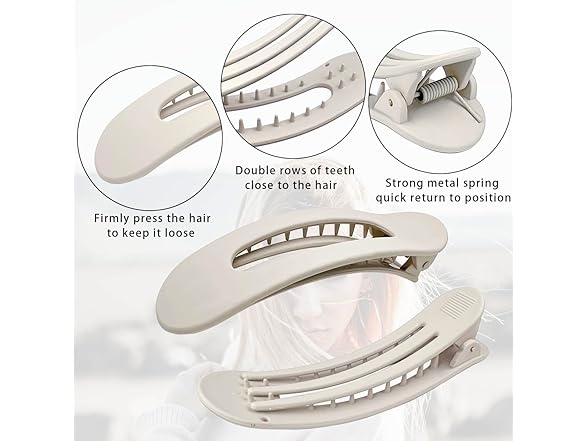 - Material: Crafted from robust acrylic and metal springs, these Flat Lay Claw Clips are long-lasting and resist bending. The anti-slip design keeps your hair secure, whether wet or dry.