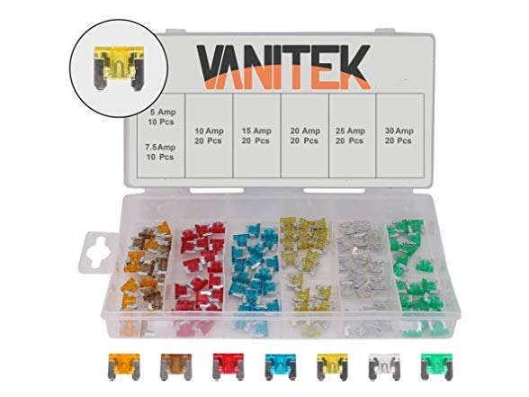 - The Vanitek set includes 10 pieces of 5 amp, 10 pcs of 7.5, 20 pcs of 10, 20 pcs of 15, 20 pcs of 20, 20 pcs of 25, and 20 pcs of 30.