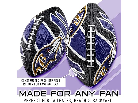 - BALTIMORE RAVENS FOOTBALL: This rubber mini football is constructed from durable rubber so you can keep the fun going at your tailgates, the beach, the backyard for countless hours!