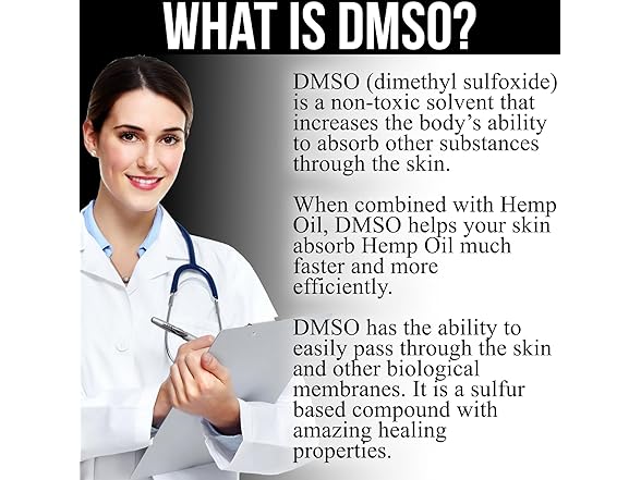 - Faster relief with DMSO! DMSO, or Dimethylsulfoxide, is a natural compound that is known for its ability to penetrate deep into the skin and provide relief for discom-fort and swelling, allowing up to 90% absorption. It's used widely to help increase the effectiveness of topicals and is often sold individually to assist with this. Re-Tune already has it!