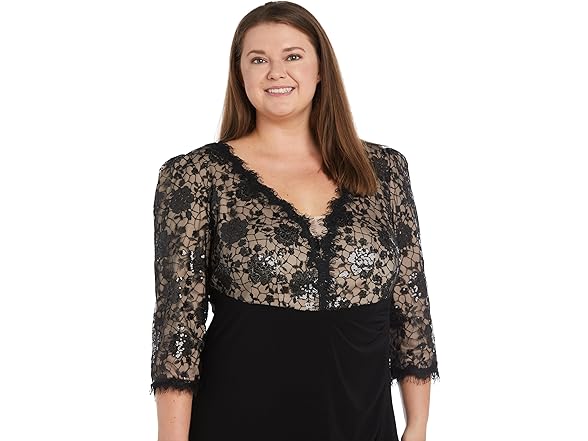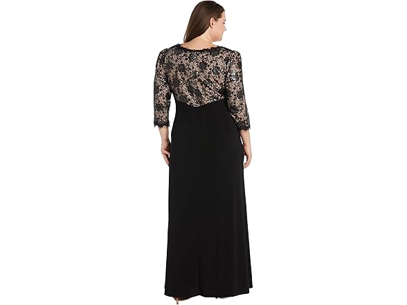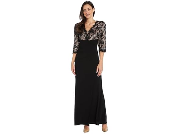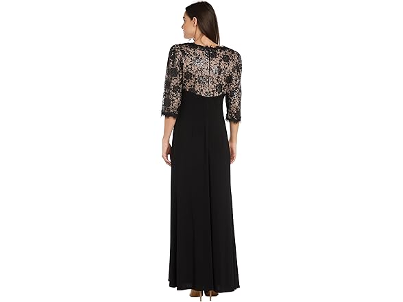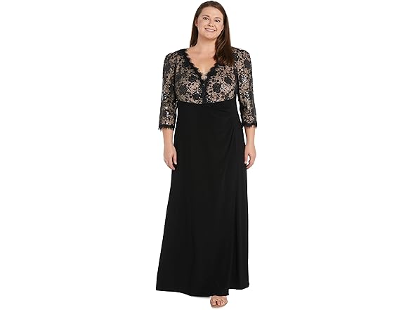 R&M Richards Women's V-Neck Cocktail Maxi Dress W/ 3/4 Sleeves, Sequin Lace Bodice & Ruched Jersey Knit - Black/Nude
