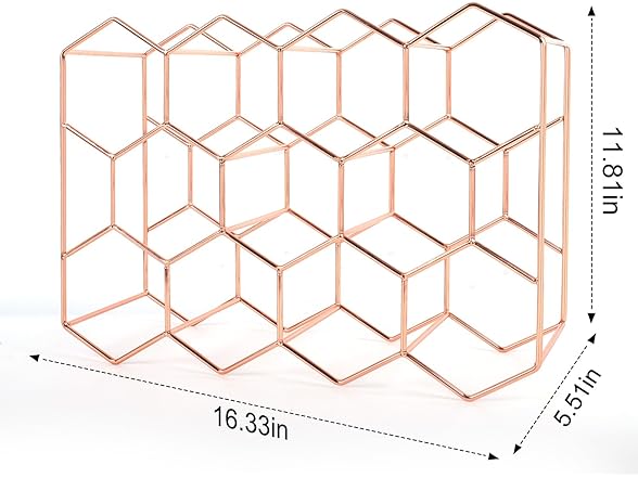 (1) Rose Gold Countertop Wine Rack 14 Bottles, Geometric Stainless Steel Wine Bottle Holder,3 Tier Wine Racks for Cabinet Pantry Bar Table No Assembly Required