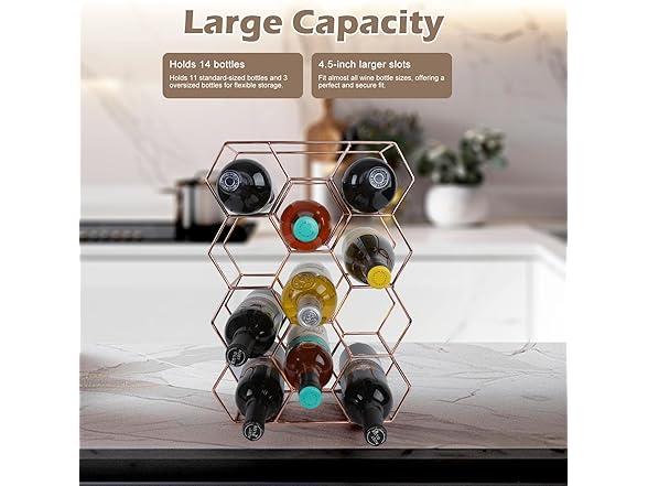 - The Core Function Of The Wine Rack: 16.73"D x 11.81"H x 5.47"W heavy-gauge iron construction ensures zero wobbling. Stores 14 bottles securely (11 standard + 3 oversized) - This is a perfect wine cabinet or countertop for displaying wine racks and convenient, efficient storage methods