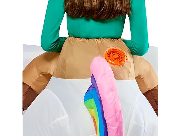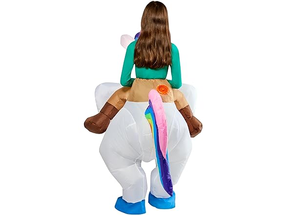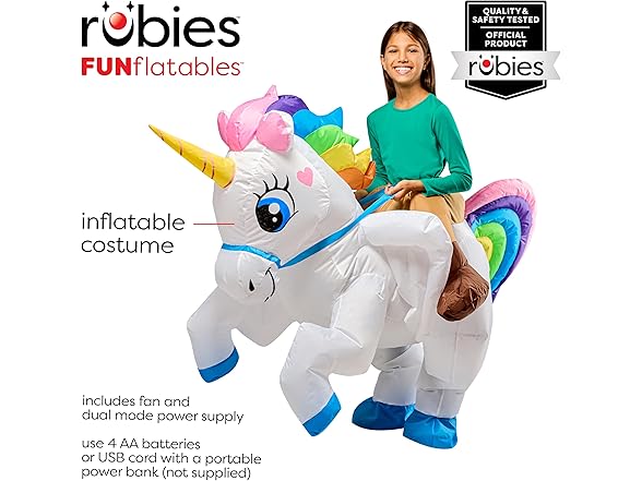 Our kids’ Inflatable Ride-A-Unicorn costume is perfect for dress-up, cosplay, everyday character play, theater stage costuming, Halloween parties, trick-or-treating, and more. Costume includes fan and Inflatable Ride-A-Unicorn costume which covers the lower body and leaves the upper body, including arms, free, featuring white unicorn with rainbow mane and light-up horn (batteries are required and sold separately). This must-have inflatable costume fits most kids 64"-72" tall and is perfect for any kid who wants to celebrate Halloween in style! Ideal for Halloween costume contests, parties, trick-or-treating, or any occasion. Look to Rubies for classic and licensed pieces for every costume occasion and season: Halloween, Christmas, Mardi Gras, Easter, and all occasions in between.