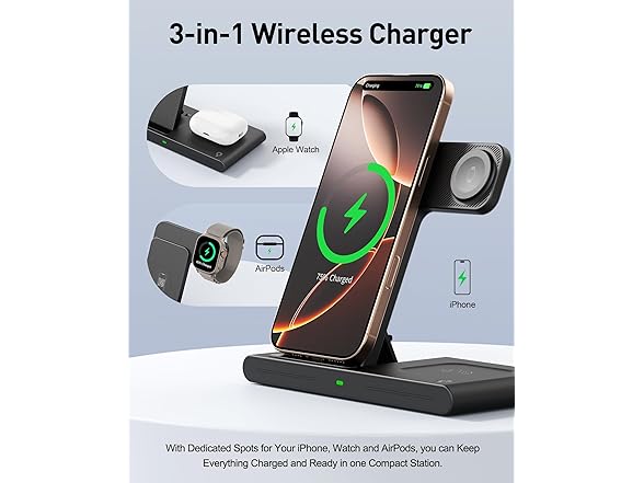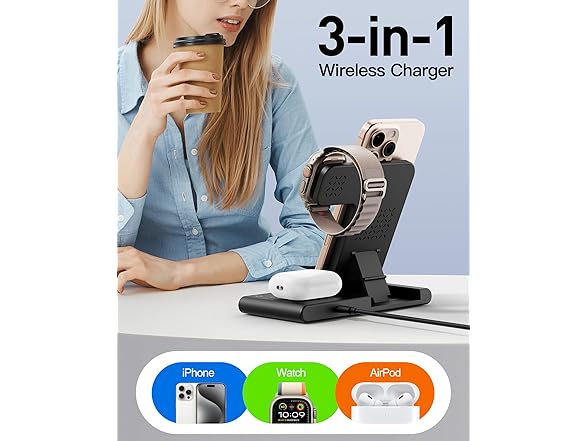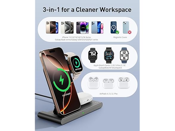 - Wide compatibility: Wireless charger phone charging position without magnetic suction function for iPhone 17/16/15/14/13/13/12/11/12Mini/Pro/Pro Max/XS/XR/XS MAX/X/8/Plus/watch and headphones only support i Phone models iWatch 10/9/8/7/6/5/4/iWatch. 3/2/SE/Ultra/Ultra 2 and Air Pods 2/3/4/Pro/Pro 2 ,for And-roid/Samsung series (Headset model: Galaxy Buds series;Galaxy Watch4 Smartwatch ;Samsung mobile phones (Galaxy S series: Galaxy S24/S23/S22/S21 series) (Note: only supports wireless charging devices; Air Pods are only compatible with wireless charging cases).