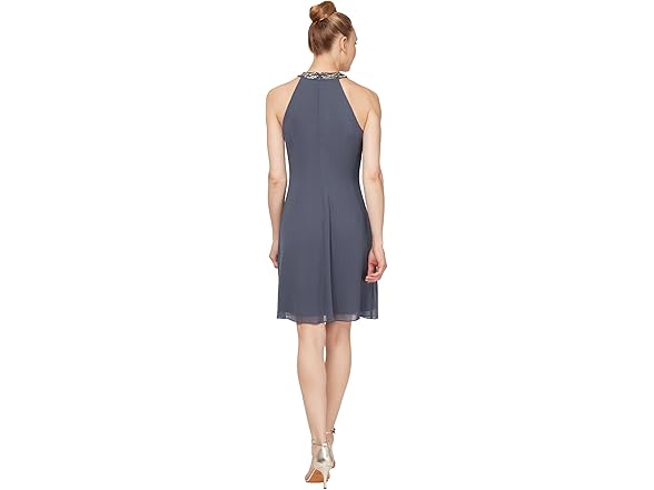 S.L. Fashions Women's Jewel Halter Neckline Cocktail, Wedding Guest, Perfect Party Dress (Petite and Regular Sizes), Steel, 6