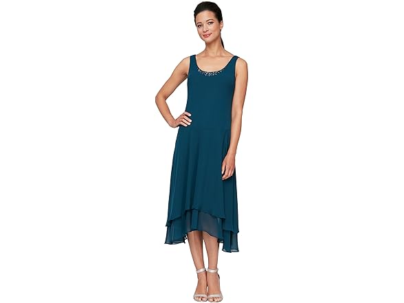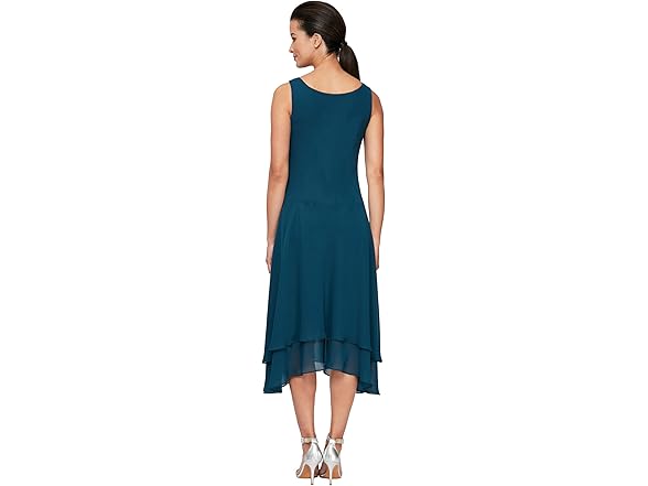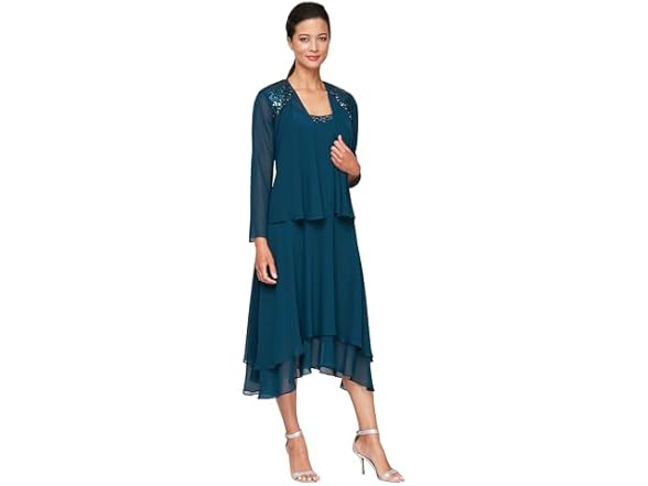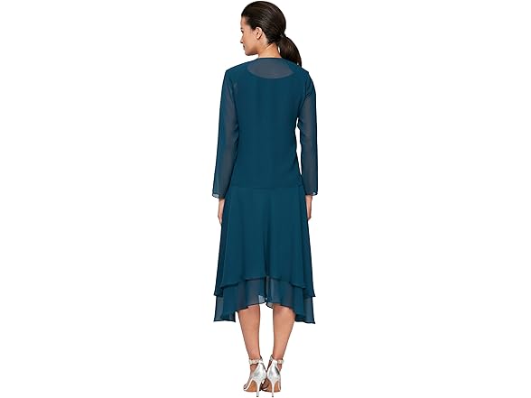Elevate your formal wardrobe with the s.l. Fashions women's two-piece dress with embellished jacket. This elegant set includes a sleeveless lined chiffon dress with a beautifully beaded embellished scoop neckline and a high-low tiered hemline, offering a sophisticated and chic look. The dress is complemented by a removable open-front jacket, featuring long sleeves, lace and beaded shoulder details, and shoulder pads for a structured and refined silhouette. The hem hits at the calf, providing a flattering fit for all body types. perfect for mothers of the bride or groom, this traditional ensemble combines timeless style with modern touches, making it the ideal choice for weddings, receptions, and other formal events. The intricate embellishments and classic design ensure you’ll look and feel your best, making unforgettable memories on your special day.